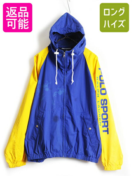 【10%OFFクーポン!!5/2】 90's 大きいサイズ XL ■ POLO SPORTS ポロスポーツ ラルフローン 2トーン 袖プリント パーカー ジャケット ( メンズ ) 古着 90年代 ポロ| 中古 男性 オールド ラルフ RALPH LAUREN 青 黄 バイカラー ジャンパー フードパーカー セーリング コット