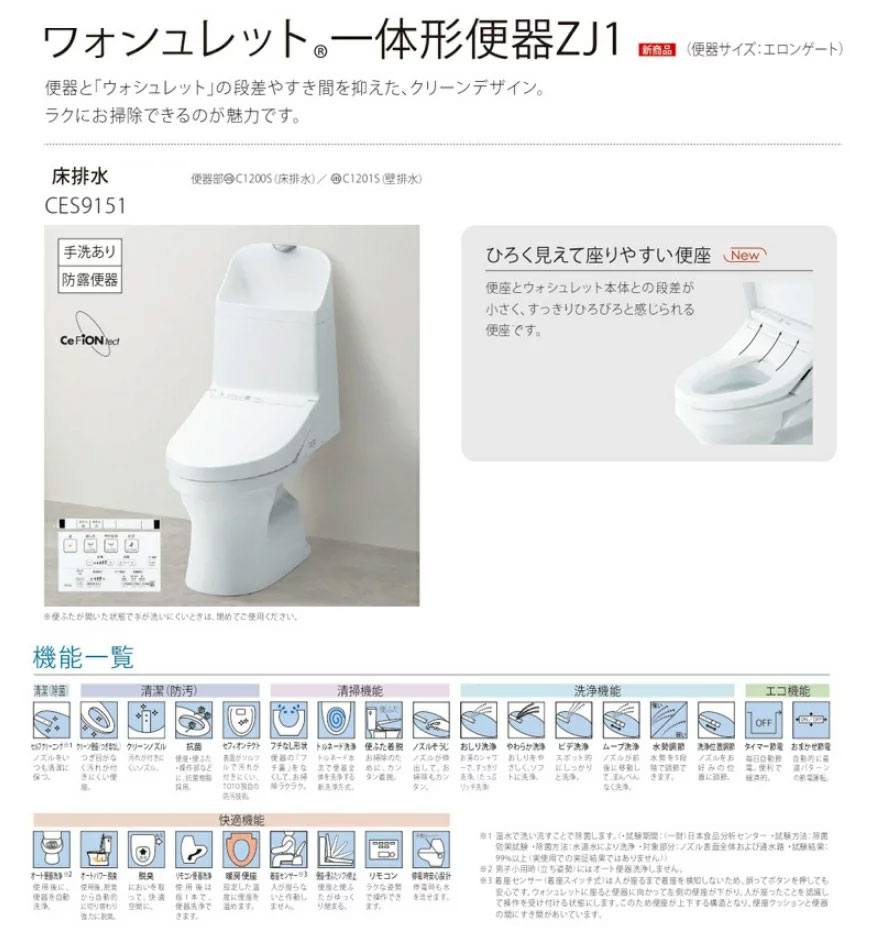 ◆メーカー:TOTO ◆型番:CES972(CES967の後継品)CES-972 ◆品名:ウォシュレット一体型便器 HV 床排水 手洗い有り ◆色:ホワイト ◆床排水:200mm ◆一般地(流動方式兼用) ◆洗浄水量:大4.8L小3.6L ◆ウォシュレット貯湯式:0.64L ◆防露層付 ◆セフィオンテクト ◆エロンゲート:大形サイズ ◆エコ機能:タイマー節電、おまかせ節電 ◆洗浄機能:おしり洗浄、やわらか洗浄、ビデ洗浄、ムーブ洗浄、洗位置調節、水勢調節 ◆清潔機能:セルフクリーニング、抗菌、クリーン便座、クリーンノズル、オートパワー脱臭、脱臭、トルネード洗浄 ◆清掃機能:便ふた着脱、ノズルお掃除機能 ◆快適機能:暖房便座、着座センター、リモコン、リモコン便器洗浄、オート洗浄、便座・便ふたソフト閉止、停電時安心設計 ◆リモコン:単三形アルカリ乾電池2個 ◆北海道・沖縄・離島は別途送料が必要となります。